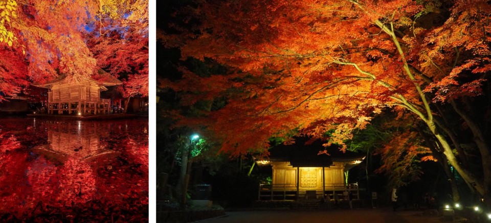 体验过年糕文化后,再前往江刺藤原之乡。这座历史主题公园建于1993年,精心复原了平安时代的都城风貌,可以感受到日本平安时代的风情、体验古代日本人的生活方式。在秋季,枫叶将公园装点得如诗如画。而当夜幕降临,园内华灯点亮,灯光与枫叶交相辉映,营造出一种神秘而又浪漫的氛围。灯光下的枫叶,不仅色彩更加丰富,更添了几分魅力。